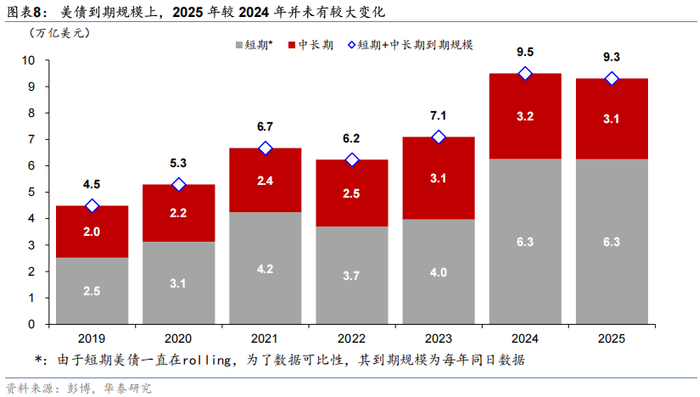由于财政赤字是美债供给的主要驱动因素,2026财年美债供给压力或超预期。美债供给等于预算赤字+财政部现金余额(TGA)变动-其它手段融资+SOMA赎回。在TGA变动、其他融资手段以及SOMA赎回不发生超预期变化的情况下,预计2026财年美债供给为2.3万亿美元,超过一级交易商的预测(2.15万亿美元)。但财政部仍有腾挪空间,即增加短债占比避免付息国债发债计划明显增加。美国对海外加征关税可能削弱海外美债需求,加剧美债市场的供需矛盾(参见《论美债利率无序上升的必然性》,2025/4/9)。