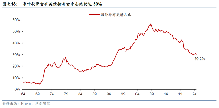 美国对海外加征关税可能削弱海外美债需求,加剧美债市场的供需矛盾(参见《论美债利率无序上升的必然性》,2025/4/9)。海外投资者是美债市场的重要参与者,截至2025年4月,海外投资者在美债需求中占比为30%(图表18)。特朗普对海外加征关税以及潜在的海湖庄园协议导致投资者可能质疑美债的安全性,官方投资者和私人投资者均可能减少美债的配置。此外,关税若导致美国经常项目逆差收窄,也可能减少通过资本项目投向美债的规模。往前看,美债市场供需矛盾可能加剧,极端情况下可能导致美债收益率无序上行(参见《论美债利率无序上升的必然性》,2025/4/9)。