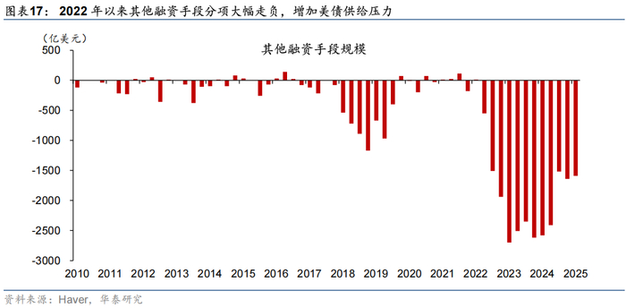 其他融资手段(other means of financing)指非市场化融资渠道,当财政部扩大其他手段融资规模时,会相应减少二级市场国债供给。其他融资手段主要有四项:直接贷款是财政部向地方政府发放诸如学生贷款、小企业贷款等具有一定具体政策意图的贷款工具;联邦融资银行贷款是指隶属于财政部的联邦融资银行(Federal Financing Bank)为某些联邦项目(如住房抵押、农业贷款)提供低成本融资;向州和地方政府发行SLGS债券[4]帮助地方政府管理债务再融资或预留建设基金;政府内部账户变动是指财政部与联邦政府内部账户(如信托基金)之间的资金流动或债务操作。当财政部扩大其他手段融资规模时,会相应减少二级市场美债发行。由于其他融资手段政策性较强,且囊括内容繁杂,整体可预测性不高。2022年以来其他融资手段分项大幅下降,增加美债供给压力,2024年三季度以来有所收窄,但维持在每个季度1500亿美元左右的规模(图表17)。