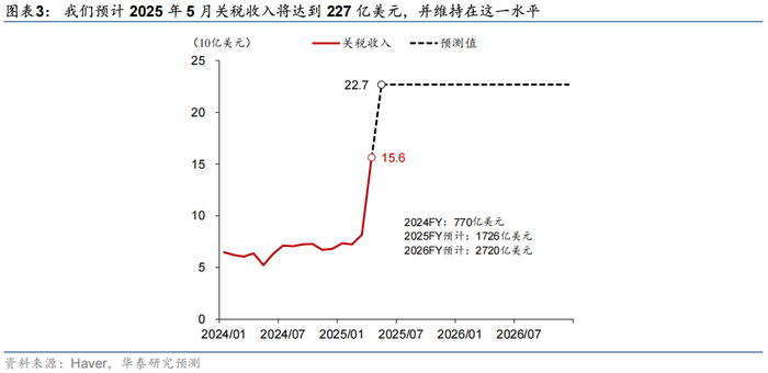美国未来财政赤字规模主要受到关税以及美丽大法案影响。根据CBO的预测,在不延长2017年特朗普减税的情况下,未来十年美国财政赤字率平均为5.9%。未来财政赤字前景主要受特朗普关税政策以及大美丽法案影响。一方面,特朗普加征的关税有助于增加财政收入降低赤字。特朗普当前对各国加征的关税导致美国加权进口关税税率上升超过10个百分点,而CBO的测算显示,美国对全球普遍加征10%关税十年累计带来财政收入2.1万亿美元(平均每年约2100亿美元),相当于2024年GDP的0.6%。2025年4月美国关税收入达到156亿美元,同比增速达到146%,但是从财政部日度的关税收入数据可以看到,截至2025年5月22日关税收入还在上升,我们预计2025年5月关税收入将达到227亿美元,并维持在这一水平(图表3)。这意味着美国关税收入将从2024年(日历年,未注明财年均为日历年,下同)的770亿美元上升1950亿美元至2025年的2720亿美元,与CBO的测算基本相当。此外,美丽大法案预计推高美国财政赤字规模,具体幅度还取决于参议院的修改情况。5月22日,美国众议院通过One Big Beautiful Bills(简称“美丽大法案”),包含减税、增加国防和边境相关支出、削减支出以及提高债务上限等内容,我们初步估计,上述法案将导致未来十年美国财政赤字合计增加3.1万亿美元。6月开始,参议院将审议众议院通过的“美丽大法案”,预计参众两院最终能够达成的妥协将指向财政扩张力度更大:即减税规模更大,支出削减力度更小。我们假设参议院修订后,最终版本的“大美丽法案”的减税规模将额外扩大1万亿美元,削减支出将下降0.69万亿美元,即未来十年赤字额外增加1.69万亿美元(参见《众议院的“美丽大法案”和日益恶化的美债前景》,2025/5/24)。