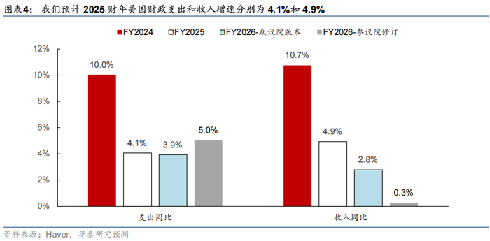 综合考虑关税收入以及众议院美丽大法案执行节奏后置的影响,预计2026财年美国财政赤字规模可能扩大至2.2万亿美元,赤字率上升至7%,明显高于预期。考虑参议院修改后,美丽大法案中的减税和扩大开支等措施在2026财年更全面落地,预计2026财年美国财政收入和支出增速分别为0.3%、5%,财政赤字规模为2.2万亿美元,赤字率为7%,超过彭博一致预期的6.7%。同时,如果美债利率持续上升,不排除利息支出超出预期。