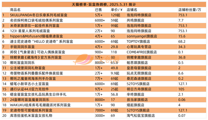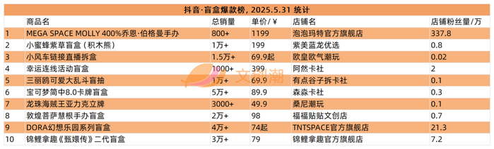 在实时更新的抖音盲盒热销榜,文创潮5月31日统计到的前五名如图所示。