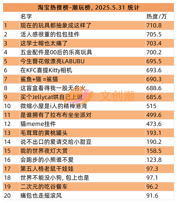 淘宝热搜潮玩榜,每日实时更新,文创潮5月31日统计到的前五名分别是:
