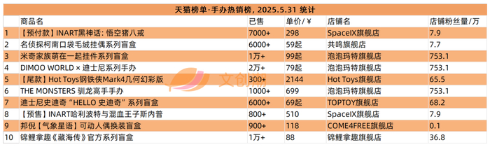 接下来,本期我们继续观察盲盒与手办的爆款产品,随后各类文创产品与店铺的一周榜单,以及国产IP相关店铺表现。
