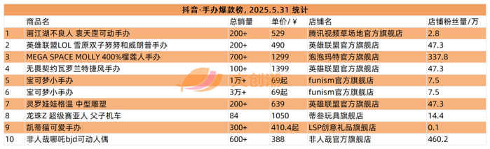 实时更新的抖音手办爆款榜,5月31日文创潮统计时的前五如图所示。