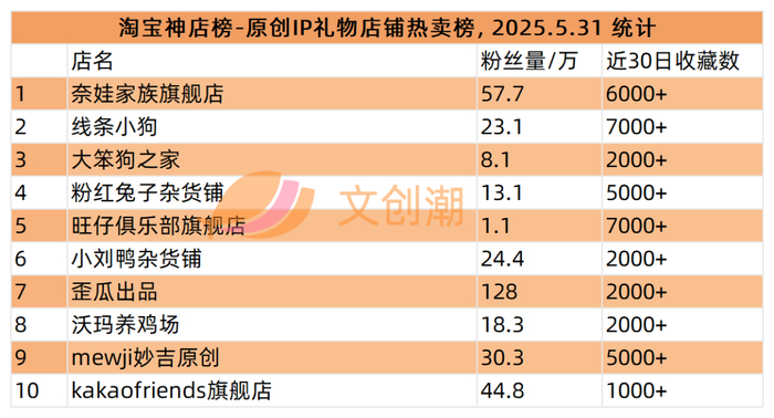 本周统计到的原创IP礼物店铺热卖榜,前五分别是: