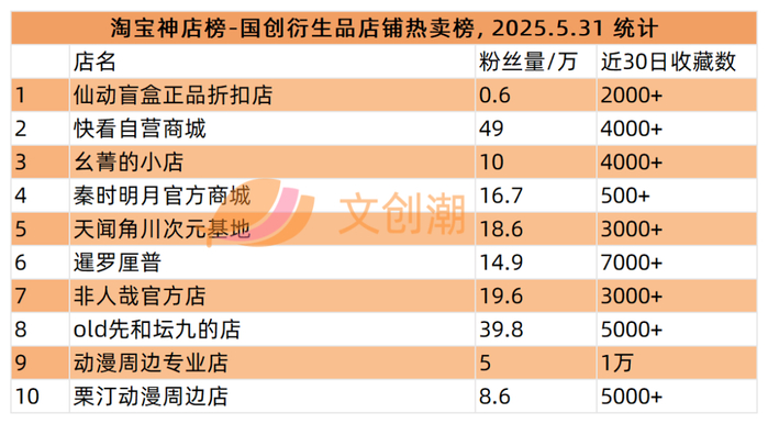 本周统计到的文创IP衍生店铺热卖榜,前五分别是: