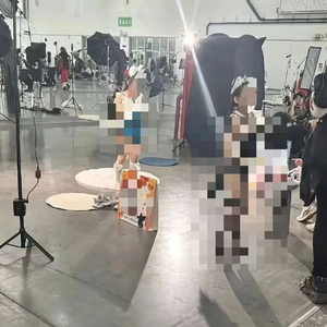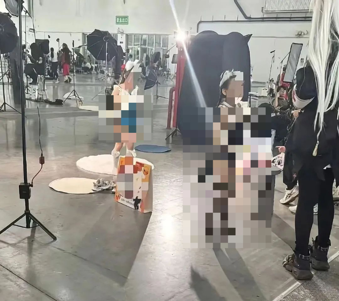 在网传的现场图片中,记者看到,在一处类似临时搭建的简易摄影场地前,有2名女童身着连体的紧身服,脚上还套有半截丝袜。