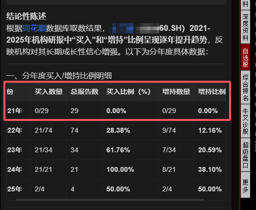 所以分析机构研报里“买入以及增持/推荐”的占比,以及这个占比的变化趋势,是能看出很多东西的,DS检索不到最新的研报,也不去官方机构爬数据,临时在网上搜别人写的文章查数据,里面写几份就算几份,每次问数量都不对,然后同花顺的数据库里绝对有完整的机构研报,一份都不会少。