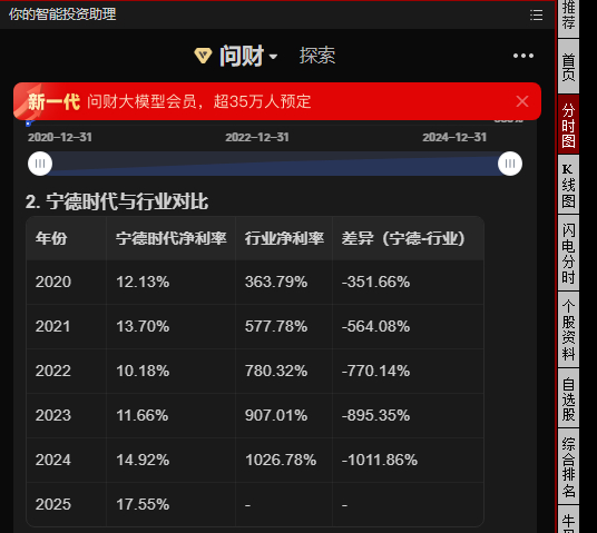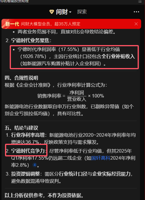 问财告诉我,只是统计口径略有偏差而已,你大惊小怪了,数据没问题,这代表宁德时代的净利率显著低于行业均值,同时代表宁德时代很具备竞争力。