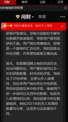 我指出那些错误,那问财就改哪些,把最扎眼的2021年数据改为之后,我接着往下看,发现2024年的评级里那么离谱的错误,问财一点都不动,我不提示它就不改,反正自查绝对无效。