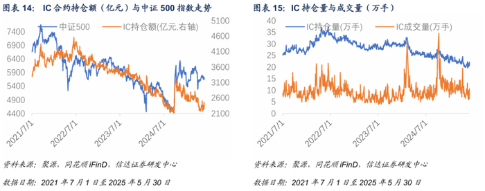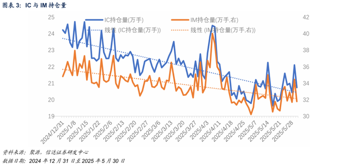 存量雪球产品陆续到期,2025年股指期货持仓量中枢持续降低。IC与IM持仓量月度均值逐月递减,5月均值分别为20.82与32.34万手,相对1月均值降幅达到11.23%与8.67%。