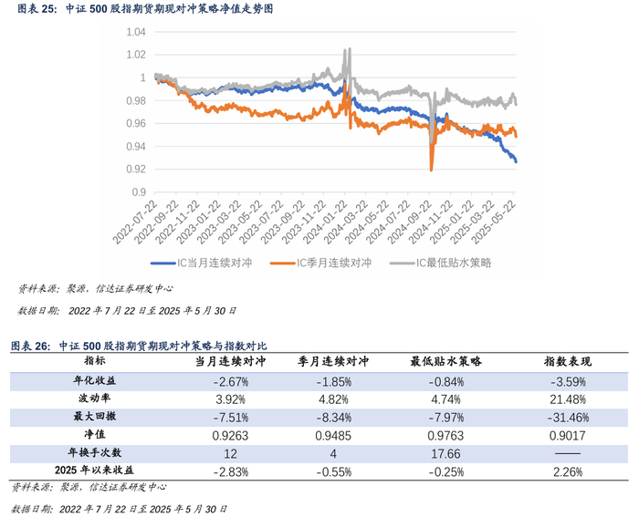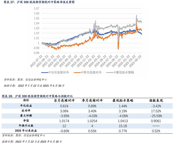 本周IC各合约基差贴水收窄,对冲策略本周出现回撤。截至2025年5月30日,最低贴水策略选择IC2512合约。