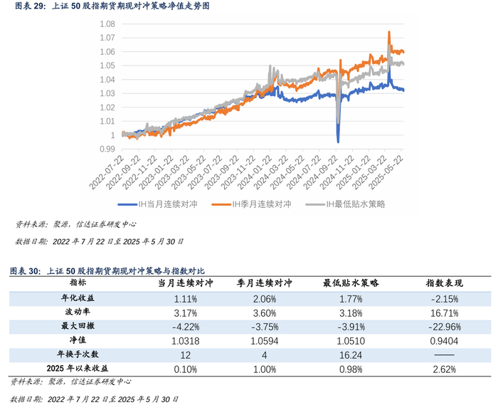 本周IH合约基差上行,贴水收窄,对冲策略本周出现回撤。截至2025年5月30日,最低贴水策略选择IH2509合约。