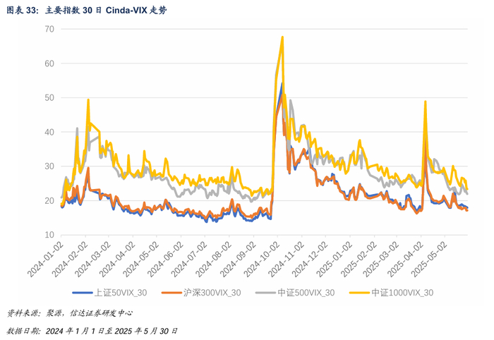 截至2025年5月30日,30日上证50VIX、沪深300VIX、中证500VIX与中证1000VIX分别为17.94、17.14、21.97及23.38。