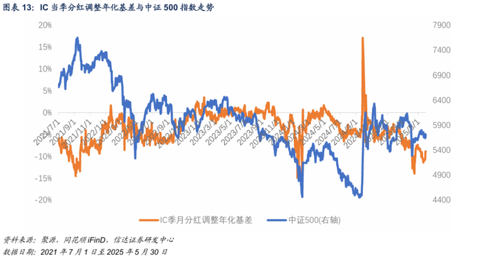 雪球类产品对基差变动的影响随产品存量降低而减弱。中证500指数涨跌幅与IC季月分红调整年化基差变动相关性由负转正:2025年1至2月两者相关系数为-0.31,而3至5月相关系数转为0.32。我们筛选出2025年标的指数单日涨跌幅较大的日期,并对比指数涨跌与基差变动的方向。2025年1至2月,中证500指数共有16个交易日涨跌幅大于1%,其中11个交易日基差变动方向与指数相反;而3至5月,中证500指数共有11个交易日涨跌幅大于1%,仅2个交易日基差变动方向与指数相反。IC基差与指数反向变动比例由68.75%降至18.18%,同期IM基差反向变动比例同样出现降低。