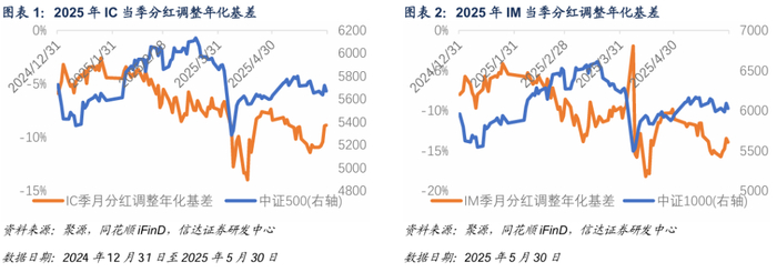 2024年末以来IC与IM当季分红调整年化基差持续贴水,二三月份贴水加深,四月IC与IM基差分别创下-13.97%、-18.20%的低点,五月以来,IC基差持续低于-8%,IM基差持续低于-11%。