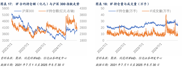 2025年5月30日,IF合约持仓额为2620.8亿元,持仓量23.07万手,成交量8.9万手。本周IF成交与持仓水平相对前一周降低。