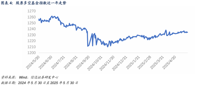 VIX有所回落,尾部风险高悬预警尚未解除:截至 2025年 5月30日,30日上证50VIX、沪深300VIX、中证500VIX、中证1000VIX分别为17.94、17.14、21.97及23.38。本周A股波动率市场呈现系统性修复态势,各品种VIX普遍回落,其中近月VIX跌幅尤为显著,中证500近月VIX值单周下挫2.8,中证1000近月VIX值下降3.3,前期"近端-远端双峰凸起"的波动率期限结构明显改善。然而偏度指标SKEW持续高企,各品种短期SKEW仍固守2024年90%分位阈值上方,沪深300SKEW达109.0点(99.7%分位),中证1000SKEW报108.4点(96.7%分位),显示投资者对极端尾部风险的定价溢价仍处历史高位。衍生品信号表明,市场在短期波动预期缓释的同时,对潜在"黑天鹅事件"的防御性戒备尚未解除。
