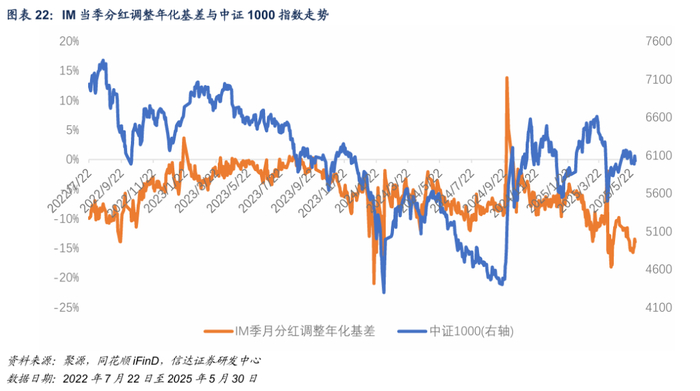 本周IM当季合约分红调整年化基差相对本周一上行,周内低点贴水15.75%,当前基差贴水13.94%,相对前一周基差上行,低于2022年初以来中位数。