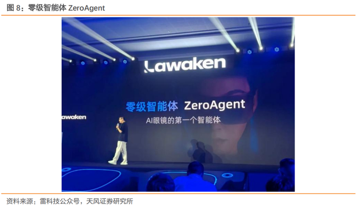 此外,李未可推出了号称 AI 眼镜的首个智能体——零级智能体 ZeroAgent。基于自研的WAKE-AI大模型与“零级智能体(ZeroAgent)”系统,新品实现三大突破:1)群体智能协作:李未可首创“智能体广场”生态,支持AI自主调用包括翻译、行程规划等多个功能型Agent,真正实现跨任务、跨场景的智能协同处理;2)自然交互革命:通过集成科大讯飞的定向降噪算法和阿里云通义大模型,ZeroAgent具备98%的高唤醒率,同时支持37种语言自动识别和无缝切换,大幅提升了语音交互的自然度和效率;3)场景生产力升级:联合米奥会展打造的“AI慧记”“AI慧写”等功能,能自动生成会议纪要和商务信函,极大提升跨国商务交流与信息处理效率,特别适用于多语种、高频沟通的会展场景。