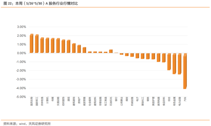5月30日美股道琼斯工业平均指数为42270.07,本周(5/26~5/30)涨幅为1.6%,5月30日纳斯达克综合指数为19113.77,本周(5/26~5/30)涨幅为2.01%。5月30日恒生指数为23289.77,本周(5/26~5/30)涨幅为-1.32%;5月30日恒生科技指数为5170.43,本周(5/26~5/30)跌幅为-1.46%。