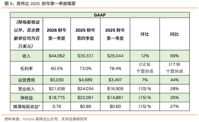 英伟达5月29日公布了2026财年第一财季财报。报告显示,英伟达第一财季营收为440.62亿美元(现汇率约合3169.06亿元人民币),同比增长69%,环比增长12%;净利润为187.75亿美元(现汇率约合 1350.35 亿元人民币),同比增长 26%,环比下降15%。英伟达预计,2026财年第二财季公司营收为450亿美元(现汇率约合3236.53亿元人民币),上下浮动2%。按业务部门划分的多项营收增长迅速:1)数据中心业务营收为 391 亿美元(现汇率约合 2812.18 亿元人民币),同比增长 73%,环比增长 10%;2)游戏和 AI PC 业务营收为 38 亿美元(现汇率约合 273.31 亿元人民币),创下历史记录,同比增长 42%,环比增长 48%;3)专业可视化业务营收为 5.09 亿美元(现汇率约合 36.61 亿元人民币),同比增长 19%,环比持平;4)汽车业务营收为 5.67 亿美元(现汇率约合 40.78 亿元人民币),同比增长 72%,环比下降 1%。其他数据方面:英伟达第一财季毛利润为 266.68 亿美元(现汇率约合 1918.04 亿元人民币),同比增长 31%;毛利率为 60.5%,与上年同期的 78.4% 相比,下降 17.9 个百分点;运营支出为 50.30 亿美元(现汇率约合 361.77 亿元人民币),同比增长 44%;运营利润为 216.38 亿美元(现汇率约合 1556.27 亿元人民币),同比增长 28%。