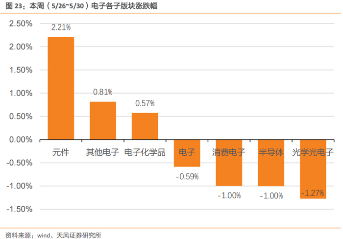 电子板块细分行业部分下跌。元件/其他电子/电子化学品/电子/消费电子/半导体/光学光电子本周涨跌幅分别为2.21%/0.81%/0.57%/-0.59%/-1.00%/-1.00%/-1.27%。