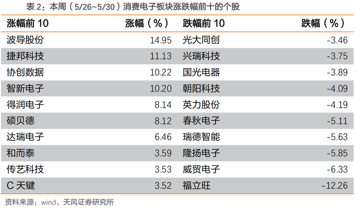 本周(5/26~5/30)消费电子板块涨幅前10的个股为:波导股份、捷邦科技、协创数据、智新电子、得润电子、硕贝德、达瑞电子、和而泰、传艺科技、C天键。