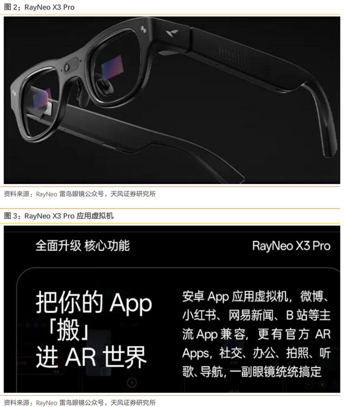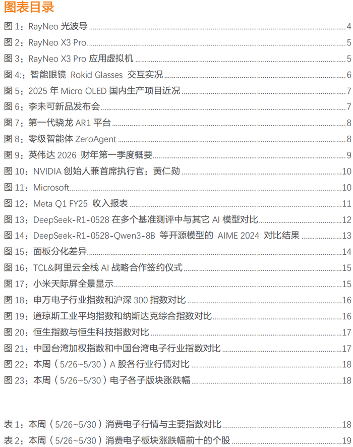 AI眼镜:雷鸟、Rokid、李未可等AI眼镜发布,看好AI眼镜融合部分手机场景功能,软硬技术成熟加持下渗透率持续提升。1) AR头部企业雷鸟创新举办RayNeo X3 Pro暨Air 3s雷鸟旗舰AR眼镜新品发布会。正式发布了新一代双目全彩Micro-LED衍射光波导AR眼镜——雷鸟X3 Pro,新一代巨幕观影眼镜雷鸟Air 3s,以及AI拍摄眼镜全新型号雷鸟V3 Slim。雷鸟X3 Pro搭载了骁龙AR1平台,在大幅降低能耗的同时还能提供卓越的AI处理和多媒体功能,实现续航与体验的双重提升,还通过RayNeo AR虚拟机,实现了AR眼镜与安卓生态系统的深度结合。2)Rokid与高德地图战略合作,联合发布首个全场景智能眼镜导航应用。Rokid Glasses是一款双目衍射光波导AR眼镜,搭载了高通骁龙AR1芯片,集成AI多模态识别技术。此次Rokid与高德地图的合作将深度融合 Rokid 的 AI+AR 能力与高德地图的空间智能,目标通过“语音+视觉+环境感知”维交互重构导航体验。3)AR眼镜市场热度持续回升,带动上游近眼显示项目的投资热度上升。多个国产企业在今年推动Micro OLED项目的落地与建设,进一步扩充国产Micro OLED的产能。4)5月25日,李未可科技推出了三款AI眼镜新品,分别定位不同用户群体的需求。面对小米等大厂入局,李未可科技选择聚焦商旅细分赛道,以「技术+数据+场景」优势构建壁垒,目标年内销量突破 10 万台,推动 AI 眼镜成为用户日常佩戴的第一选择。LAWK View:强劲的技术优势为用户带来了突破性的交互体验。此外,李未可推出了号称 AI 眼镜的首个智能体——零级智能体 ZeroAgent。