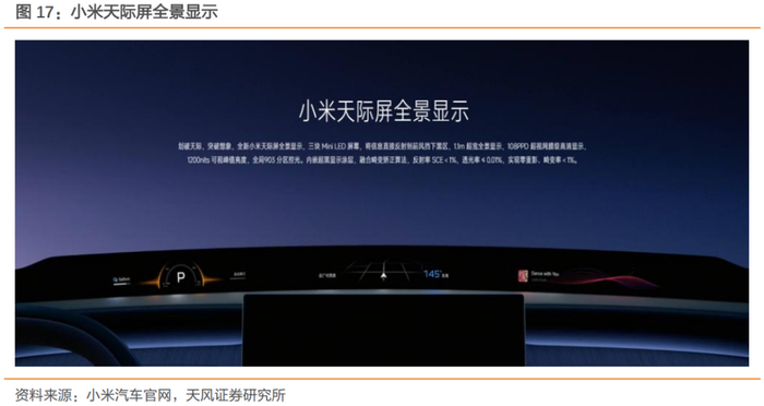 华阳集团为小米YU7提供PHUD技术支持,开启智能座舱的新时代。小米YU7采用天际屏全景显示屏取代了物理仪表盘,该显示屏采用全景曲面投影技术,由三块Mini LED屏幕,将信息直接反射到前挡风玻璃下的黑色涂层区域,1.1m超宽的全景显示108PPD超视网膜级高清显示,1200尼特峰值亮度,全局903分区控光,内嵌超黑显示涂层,融合畸变矫正算法,反射率SCE<1%,透光率≤0.01%。