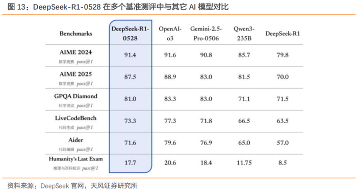 DeepSeek:DeepSeek-R1更新,思考更深,推理更强。1)DeepSeek R1 模型升级后,在多个基准测评中的整体表现已接近国际顶尖模型。DeepSeek R1 模型已完成小版本升级,当前版本为DeepSeek-R1-0528,显著提升了模型的思维深度与推理能力。相较于旧版 R1,新版在复杂推理任务中的表现有了显著提升。2)DeepSeek-R1 更新后,在多个方面取得升级进步。根据DeepSeek内部优化方向和自身的感知,这次升级集中在响应质量、响应速度、对话稳定性和API和接口兼容性等多个方面。3)DeepSeek-R1-0528模型继续开源,展现真正可落地的顶级大模型。DeepSeek-R1-0528模型以其强悍的表现,配合其开源、商用友好、免费可用等特性,真正展现了什么叫做可落地的顶级大模型——不仅强,还用得起、用得上。