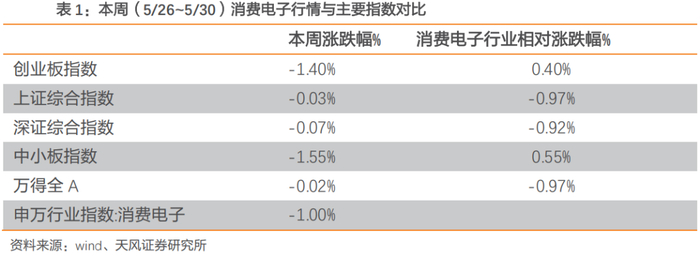 本周(5/26~5/30)消费电子行业表现跑输主要指数。本周(5/26~5/30)上证综合指数下跌0.03%,同期创业板指数下跌1.40%,深证综指下跌0.07%,中小板指数下跌1.55%,万得全A下跌0.02%,申万消费电子行业指数下跌1.00%。