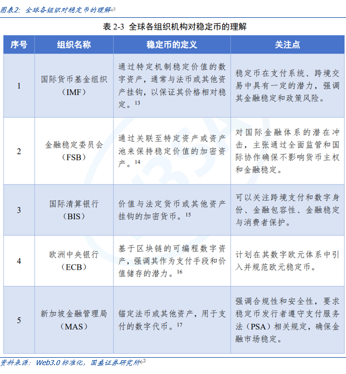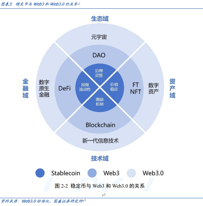 稳定币是传统货币在数字空间的延伸。2024 年1 月4 日,香港Web3.0 标准化协会发布的《香港 Web3.0 标准化白皮书(2023)》指出,Web3.0 作为数字空间的生态体系,从技术域、资产域、生态域和金融域四个方面扩展了 Web3 加密经济体系。无论在Web3加密经济体系中,还是在Web3.0 数字空间生态体系中,稳定币都发挥着重要作用,成为数字支付、资产储存和跨境转账等应用场景中的可靠工具。