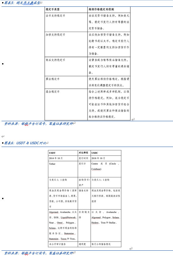 作为进行商业支付和结算的替代方式,按照维持价格稳定的不同机制划分,稳定币可以分为五大类。稳定币的主要类型包括法币支持型(以法币为抵押,如USDC、USDT、TUSD、GUSD)、加密货币支持型(以其他加密货币为抵押,如DAI)、商品支持型(以黄金等大宗商品为抵押,如PAXGold)和算法型(基于算法管理稳定性,如TerraUSD、AMPL、BAC)等。目前市场上最主流的2种稳定币为USDT和USDC,均通过以1:1的比例挂钩法定货币(美元)来提供稳定性。