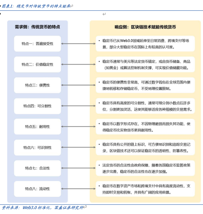 稳定币继承和延续了传统货币的特征。在人类发展历史中,货币的形式与运行模式历经多次演变,但作为经济活动的核心媒介,货币始终具备普遍接受性、价值稳定性、便携性、可分割性、耐用性、可识别性、合法性和流动性等八大特征。随着新一代信息技术的发展,尤其是区块链技术的广泛应用,稳定币在继承传统货币基本属性和关键特征的同时,也在数字场景中拓展了货币的应用模式和治理方式,为货币在全球化、数字化环境中的应用创造了新的可能性。