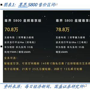 尊界S800正式发布,上市1小时大定突破1000台。根据每日经济新闻报道,华为与江淮汽车合作推出的尊界品牌首款车型尊界S800正式上市,分为增程和纯电两种规格,共计4款车型,售价区间为70.8万至101.8万元。此前该车预售价为100万至150万元。在新车发布会上,余承东表示:“尊界S800是中国智造走向高端化的一个开端,汇聚了中国汽车工业最有勇气的力量”,尊界S800上市一小时大定突破1000台。