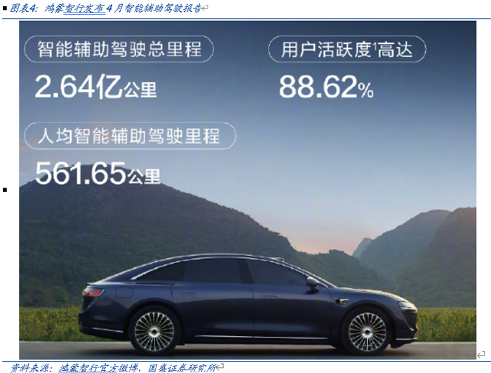 尊界S800正式发布意味着华为智驾系统正式向百万级豪车市场进行渗透,看好更多鸿蒙智行新车型发布。此前,鸿蒙智行发布4月智驾辅助报告。报告显示,鸿蒙智行4月智能辅助驾驶2.64亿公里,用户活跃度达88.62%,用户人均智能驾驶辅助里程达561.65公里,共使用智能辅助泊车1625.4万次。我们认为,目前鸿蒙智行的智驾系统水平在国内排名靠前,后续有望发布更多车型,带动自动驾驶系统整体技术水平与市场渗透率提升。