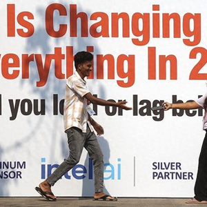 3月26日,2025人工智能开发者大会与博览会在印度班加罗尔举行。图为路人走过博览会宣传牌。(视觉中国)