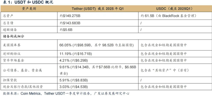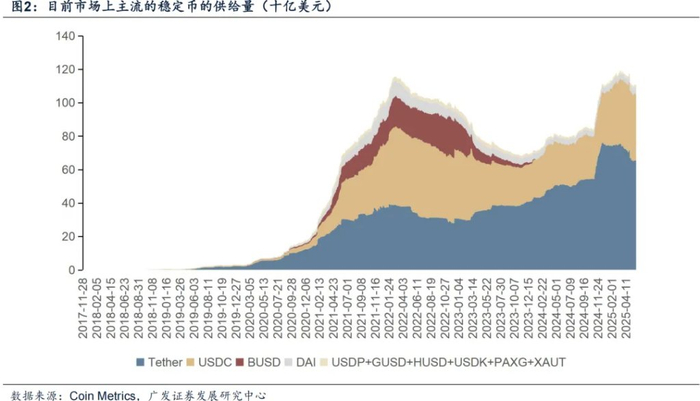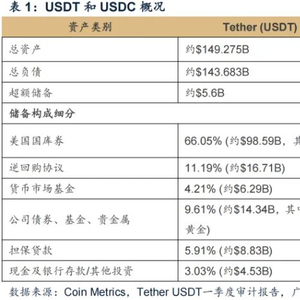 稳定币按发行和价值维持机制,可分为三类:法定货币储备支持型、加密资产抵押型和算法稳定币。其中法定货币储备支持型是最常见的稳定币类型,每个稳定币都有等值的法定货币(如美元)作为储备金支持。