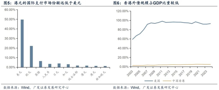 我们认为对港股来说,短期《稳定币条例草案》的出台有助于提升市场信心与拓宽投资渠道,吸引海外资金进入。香港通过的《稳定币条例草案》为稳定币发展提供了明确的监管框架,增强了市场信心,这不仅吸引了全球加密企业的目光,也为本地零售投资者提供了更安全的投资渠道,增量资金或将进入港股市场。但同时考虑到,港币在全球跨境贸易金融业务中的占比远不及美国,且外债水平与美国相比微不足道,因而其战略意义更重要。