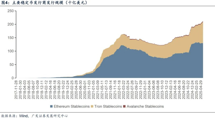 美国“GENIUS Act”的出台,表明其试图为美元寻找新“锚”的野心。目前,全球绝大多数的法定币锚定稳定币与美元挂钩,意味着稳定币实际上以美元进行交易,且间接使得稳定币持有者成为美债的持有者。美债法案要求稳定币储备以美国国债等优质资产为支撑,或将持续推动美债需求,间接巩固美国财政实力。在全球去美元化趋势加剧的背景下,稳定币或成为美国捍卫美元地位的战略工具,一定程度上缓解美元和美债的抛售压力。