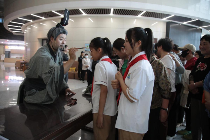 “屈原”会跟小学生们做互动问答,聊聊跟端午有关的事情。还会为他们在额头上点上朱砂,这意味着智慧开启。