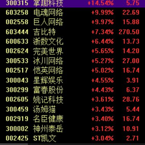 截至发稿,巨人网络、电魂网络涨停,掌趣科技涨超14%,浙数文化、完美世界、吉比特等跟涨。