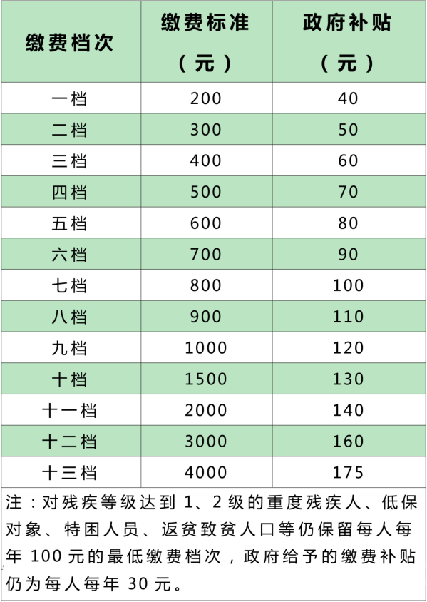 调整后的个人缴费档次为每人每年缴费300元、500元、800元、1000元、1500元、2000元、3000元、4000元、5000元、6000元。