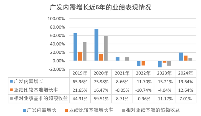 分年度看广发内需增长A的净值曲线会发现,在牛市或上涨趋势中,基金的超额收益十分突出;市场下跌时,尽量贴近业绩基准,不会明显跑输。