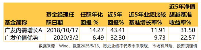 以他管理时间最长的广发内需增长A为例,近5年累计回报达43.41%,同期业绩基准仅11.91%,超越基准31个百分点。