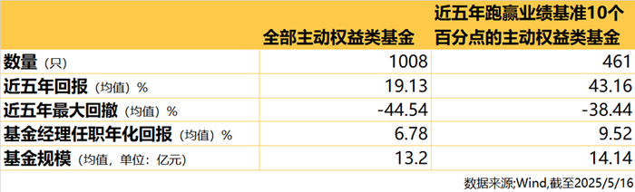 也就是说,近5年跑赢业绩基准超10%的基金,还有一些共性的特质——表现更稳健(回撤更低)、基金经理长期业绩更好等。
