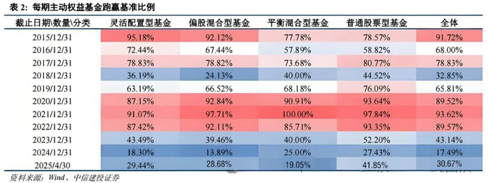 他们统计了过去十年的每年末,主动权益基金(包括偏股混合、普通股票、平衡混合和灵活配置,仅统计A类份额)滚动过去三年相对各自业绩基准的胜负情况。