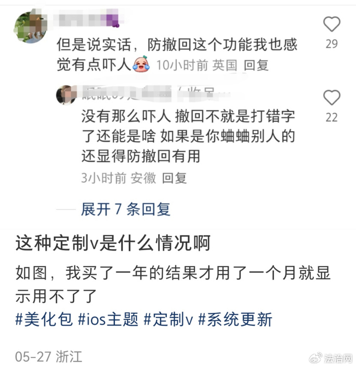 法治网记者注意到,近期有不少小红书用户发帖晒出自己购买的“定制V”服务。评论区有网友表示,“买了一年的,结果才用一个月就显示用不了了,应该是圈钱跑路了”,也有网友对其中存在的风险表示担忧,称“防撤回这个功能我觉得有点吓人”,另有部分网友称因使用“定制V”已被微信平台限制登录。